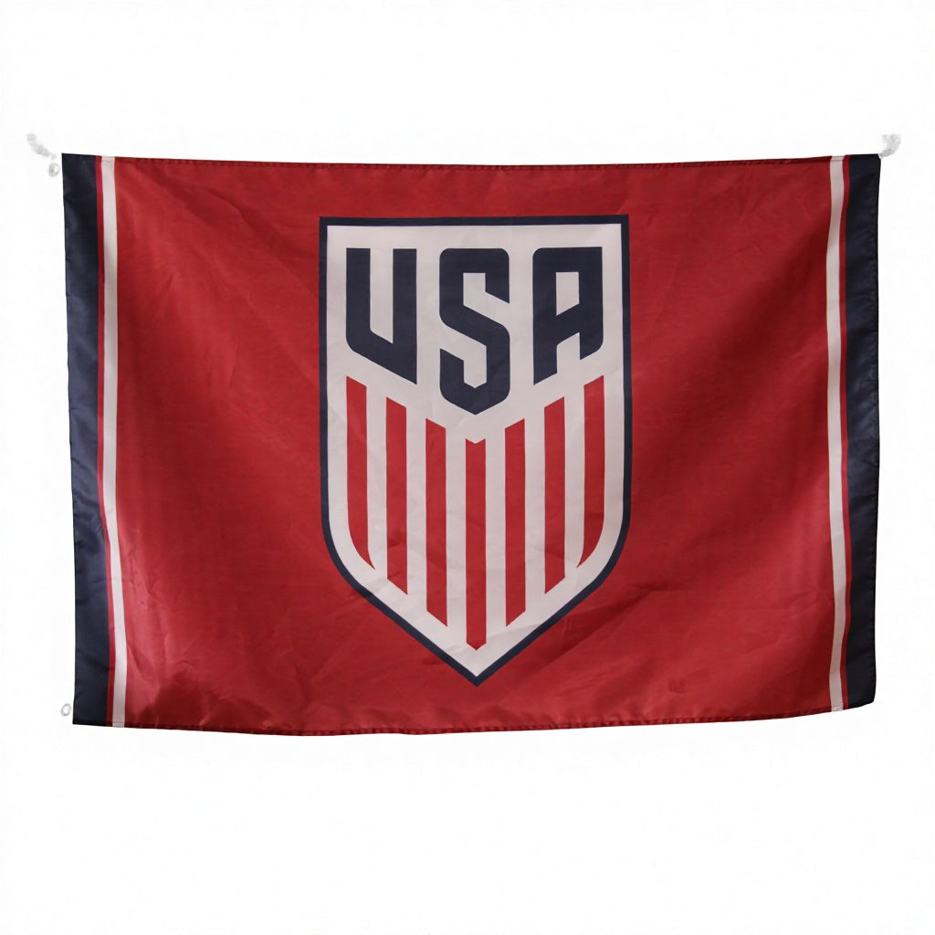 This 3x5ft USA soccer flag is crafted from durable, fade-resistant polyester. Featuring the iconic US Soccer shield logo on a bold red background, it is the ultimate fan gear for supporting the USMNT and USWNT. Equipped with brass grommets for easy hanging, it is ideal for World Cup viewing parties, soccer events, or as a proud display of patriotism in your home. We offer full customization of text, colors, and sizes to craft your unique USA soccer banner.